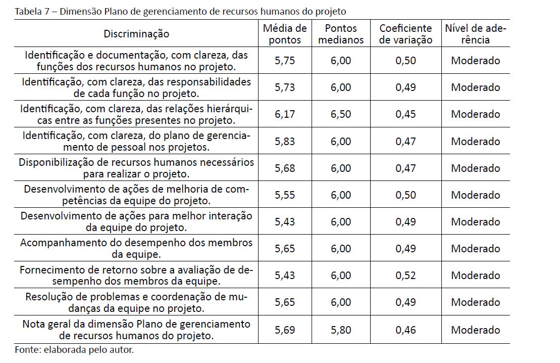 * Dimensão Plano de gerenciamento de recursos humanos do projeto (Tabela 7):