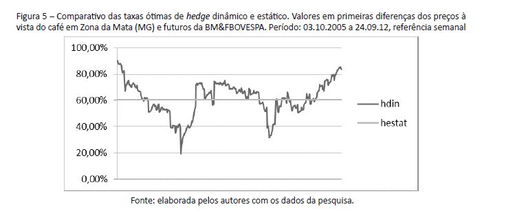 A análise visual da Figura 5 apontou a variação das taxas ótimas de hedge dinâmico dos preços semanais em Zona da Mata (MG), com períodos com diferenças positivas e negativas, dependendo da estrutura dinâmica das covariâncias entre os preços à vista e futuros. No período mais recente, as taxas ótimas de hedge dinâmico foram superiores às do hedge estático, o qual, por hipótese, foi praticado no início do intervalo temporal.