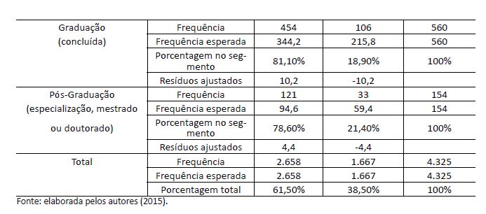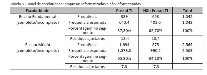 Outro resultado interessante diz respeito à escolaridade dos proprietários (c.=387,818, gl=3, r < 0,001). Percebe-se que os proprietários das empresas informatizadas possuem maior escolaridade que os proprietários das empresas sem TI (Tabela 6). O número de proprietários das empresas com TI que possuem Ensino Médio (completo/incompleto) é cerca de duas vezes maior em relação aos demais; considerando-se aqueles que possuem graduação concluída ou pós-graduação, essa proporção chega a quatro para um.