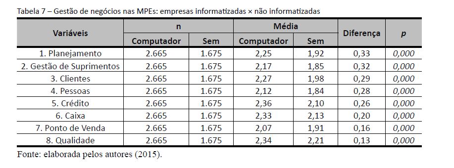 Na primeira análise, utilizou-se o teste t de student, objetivando verificar a existência de diferença estatística significativa (ao nível de 5%) entre a percepção dos empresários das MPEs que possuem computador e aqueles que não possuem esse recurso. Comprovou-se a existência de diferença estatística significativa em todas as oito variáveis analisadas, apontando um maior nível de execução de atividades administrativas para as empresas informatizadas (Tabela 7). Pôde-se perceber que, em todas as dimensões analisadas, as empresas que possuem computador obtiveram média superior às demais empresas. Com relação às atividades ligadas ao planejamento, à gestão de suprimentos e aos clientes, essas diferenças são mais acentuadas. A gestão de suprimentos pode ser potencializada com o uso da TI, especialmente através de sistemas que permitam controlar a entrada e saída de produtos, além de direcionar futuras compras e acompanhar as ordens efetuadas junto aos fornecedores – atividades predominantemente operacionais, o que corrobora resultados de estudos prévios (Lima, 2007). Diferentemente, é o caso do constructo clientes, em que o enfoque do uso da TI é mais informacional, havendo a necessidade de explorar o uso de bancos de dados que contenham informações a respeito dos seus clientes, bem como o histórico de compras e suas preferências. Chama a atenção o constructo planejamento, que normalmente é apontado na literatura como um aspecto pouco impactado pela TI nas MPEs (Gable; Stewart, 1999; Beheshti, 2004; Lunardi; Dolci, 2006) e que nesta pesquisa aparece como sendo bastante facilitada pelo uso do computador.