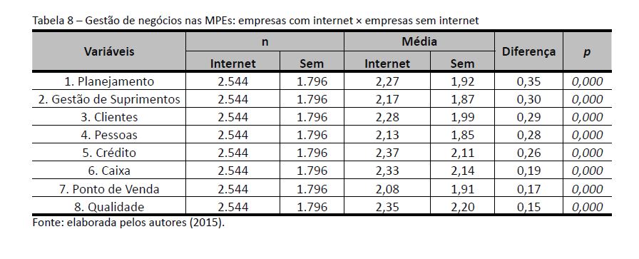 A segunda análise também foi realizada utilizando-se o teste t de student, verificando desta vez a existência de diferença estatística significativa (ao nível de 5%) entre a percepção dos empresários das MPEs que utilizavam a internet no trabalho e aqueles que não a possuíam. Da mesma forma que o teste anterior, comprovou-se a existência de diferença estatística significativa em todas as oito variáveis analisadas, apontando para uma melhor gestão aquelas empresas que fazem uso da internet para o seu trabalho (Tabela 8). Da mesma forma que no teste anterior, os constructos Planejamento, Gestão de Suprimentos e Clientes aparecem como aqueles cuja diferença entre as empresas que possuem tecnologia – desta vez, utilizando a internet no seu dia a dia – é mais acentuada que as demais. A internet pode auxiliar as MPEs tanto na busca quanto na recuperação de informações sobre o seu negócio, seus clientes e até mesmo seus fornecedores (Turban et al., 2010). Além disso, permite uma maior aproximação de seus parceiros, seja consultando sites de fornecedores ou ainda utilizando ferramentas de comunicação tanto com os fornecedores quanto com seus clientes. Segundo Chong et al. (2009), o uso de tecnologias, especialmente a internet, torna a comunicação mais eficiente e efetiva entre os fornecedores e clientes, possibilitando um melhor fluxo informacional. Não obstante, auxilia a coleta de informações do ambiente competitivo, pois a crescente competitividade dos mercados e a rápida evolução tecnológica tornam vital que as pequenas empresas tenham, em mãos, informações precisas e atualizadas sobre o seu ambiente de negócio (Pelissari et al., 2012).