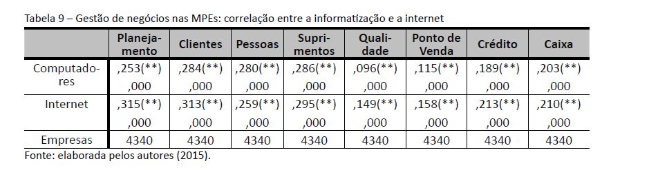 Mesmo existindo uma baixa correlação entre as práticas de gestão de negócios das MPEs e a utilização de computadores e da internet, pode-se ressaltar alguns aspectos. Gestão dos suprimentos e clientes estão mais correlacionadas com a utilização de computadores da empresa, pois ambos os constructos são mais relacionados com aspectos de controle em que a utilização de computadores pode auxiliar. Cadastro, localização e expectativas dos clientes, por exemplo, podem ser controlados e realizados utilizando tecnologias simples, como processadores de textos e planilhas, que auxiliam os gestores. Similarmente, essas tecnologias podem ser utilizadas para controlar estoques, entradas/saídas de produtos, cadastros de fornecedores e considerações sobre o desempenho do fornecedor. Da mesma forma, estas tecnologias simples, particularmente as planilhas, podem ser usadas na gestão de pessoas, como, por exemplo, no acompanhamento das metas de vendas, uma das variáveis deste constructo.