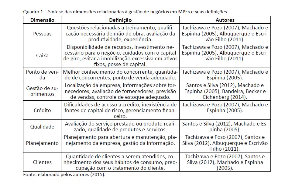 Albuquerque e Escrivão Filho (2011), ao realizarem uma pesquisa bibliográfica, identificaram que a gestão necessária para as MPEs evitarem a sua mortalidade e aumentarem a sua chance de sobrevivência está relacionada com fatores internos (relacionados ao dirigente e à empresa) e externos (relacionados ao ambiente). Aspectos relacionados ao dirigente seriam o capital próprio, a experiência, o seu nível educacional, os motivos para abertura do negócio e suas características individuais. Em relação à empresa, os autores apontam os recursos das áreas, o planejamento, a gestão da informação e a estrutura organizacional como os principais. Em relação aos fatores externos – ambiente do negócio –, foram destacados aspectos como mercado consumidor, fornecedor e concorrentes; conjuntura econômica; acesso a financiamento e novas tecnologias; e legislação. Assim, a partir dos elementos identificados, apresenta-se, no Quadro 1, uma síntese de diferentes aspectos relacionados à gestão de negócios em MPEs.