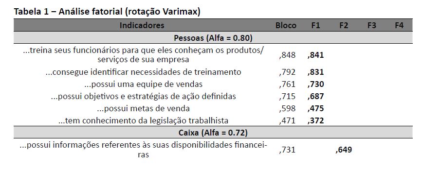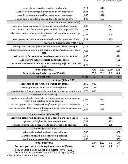 A análise fatorial (com rotação Varimax) confirmou oito dos dez fatores propostos, obedecendo a dois critérios: o grau de associação entre as variáveis e o grau de subjetividade destas. Das 37 questões nomeadas, cinco foram eliminadas do instrumento por apresentarem baixas cargas fatoriais nos fatores propostos inicialmente. Assim, os oito fatores confirmados explicam 54,4% das variações das medidas originais (32 questões), o que representa um razoável nível de representação dos dados, facilitando seu manuseio e interpretação. A Tabela 1 apresenta as cargas fatoriais de cada construto, de acordo com a sua formação nos fatores e dentro do seu próprio bloco. A fidedignidade dos fatores foi apontada pelos coeficientes do alfa de Cronbach (Tabela 1). O instrumento apresentou valor igual a 0,89, enquanto os coeficientes dos fatores situaram-se entre 0,54 e 0,80, apontando boa consistência interna em cinco dos oito constructos. Os constructos Planejamento, Clientes e Qualidade apresentaram coeficientes abaixo do indicado pela literatura (Malhotra, 2001), que deve variar entre 0,60 e 0,70. Entretanto, alguns autores, como Siddiqui e Anjum (2013), sustentam que, em estudos exploratórios, valores acima de 0,50 podem ser considerados satisfatórios, especialmente se os indicadores desses constructos forem coerentes e apresentarem consistência teórica. Por estarem enquadrados nessas condições, de estudo exploratório, todas as variáveis foram mantidas na análise. Ademais, serão usadas apenas em análises correlacionais, que, segundo Barbetta (1998), correspondem a uma técnica estatística normalmente utilizada em estudos de natureza exploratória, um estágio intermediário na análise de qualquer questão de pesquisa.