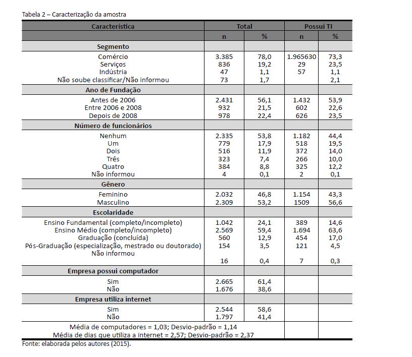 A Tabela 2 apresenta a caracterização da amostra. As empresas investigadas são predominantemente do ramo comercial (78%), destacando-se empreendimentos como lojas de confecções, locadoras de CD e DVD, bares e lancherias, padarias, mercearias, minimercados e ferragens. Quanto ao ano de fundação, percebe-se que quase 60% da amostra possuía mais de cinco anos de existência (empresas fundadas antes de 2006), enquanto o número de empresas que iniciaram suas atividades depois de 2008 se aproximava do grupo de empresas fundadas entre 2006 e 2008.