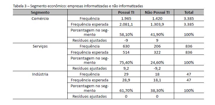 Investigando-se a associação entre adoção de TI e outras variáveis categóricas por meio do teste do qui-quadrado e da análise de resíduos ajustados, também se verifica a ocorrência de uma série de associações entre empresas informatizadas e Segmento de Atuação, Ano de Fundação, Número de Funcionários e Escolaridade. Percebe-se que as empresas prestadoras de serviços são predominantemente informatizadas (75,4%), conforme mostra a Tabela 3. A análise inferencial dos dados permite afirmar que existe uma associação estatisticamente significativa (c.=84,813, gl=2, r < 0,001) entre o segmento de atuação e a adoção de TI. Analisando os resíduos ajustados, verifica-se que as células que mais contribuíram para a existência dessa associação foram as do segmento prestador de serviços (valor absoluto dos resíduos ajustados igual a 9,2, sendo positivo em Possui TI) e do segmento comércio (valor absoluto dos resíduos ajustados igual a 9,0, sendo negativo em Possui TI). Assim, há uma associação significativa (valor absoluto dos resíduos ajustados na célula maior que 1,96) entre ter comércio e não possuir computadores, inversamente ao que acontece no grupo de empresas prestadoras de serviços.