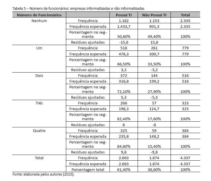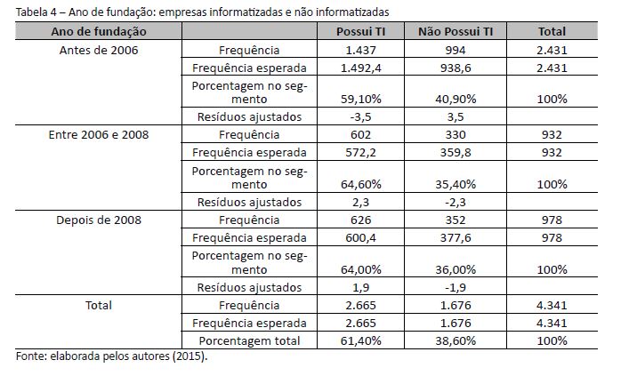 Similarmente, o estudo revela associação estatisticamente significativa entre TI e ano de fundação da empresa (c.=12,185, gl=2, r < 0,002). A menor taxa de informatização encontra-se no grupo das empresas criadas há mais tempo (antes de 2006), das quais 40,90% não possuem TI, conforme se pode observar na Tabela 4. Também é este grupo o que mais contribui significativamente para a relação de dependência entre as variáveis, pois apresenta o maior valor absoluto dos resíduos ajustados.