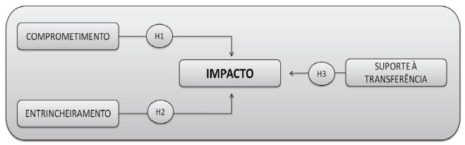 A partir da suposição básica do estudo – de que pessoas mais comprometidas tendem a impactar de forma mais efetiva o setor de trabalho após seus cursos de graduação e/ou pós-graduação, enquanto pessoas entrincheiradas não conseguem a mesma efetividade de impacto daquelas comprometidas –, foram definidas três hipóteses gerais: H1 - o comprometimento organizacional influencia positivamente o impacto do treinamento no trabalho (amplitude) após seus cursos; H2 - o entrincheiramento influencia negativamente o impacto do treinamento no trabalho; H3 - o suporte à transferência de treinamento afeta o impacto do treinamento no trabalho. Com base nessas concepções e hipóteses, esta pesquisa se baseou no desenho de pesquisa ilustrado a seguir, na Figura 1.