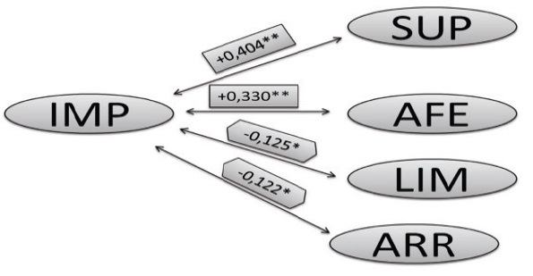 Fonte: dados da pesquisa.Observa-se que a correlação de Spearman mede apenas a relação e não a causa entre as variáveis. Ainda, é possível verificar que grande parte dos construtos possui o coeficiente de correlação (r de Spearman) relativamente baixo (entre -0,125 e 0,330), mas, mesmo sendo baixo, este é explicado por psicólogos como um resultado satisfatório, visto que as variáveis possuem um cunho cognitivo (GOUVEIA; SANTOS; MILFONT, 2009 apud RIBAS, 2010).