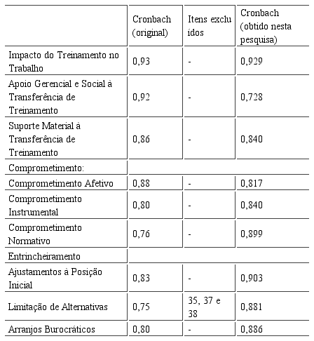 O fator único impacto do treinamento no trabalho contém doze itens e expressa a percepção do participante sobre os efeitos exercidos pelo treinamento em seu próprio desempenho e em sua motivação no trabalho (ABBAD, 1999). Os itens de suporte à transferência de treinamento serviram para medir o grau de apoio recebido pelo servidor ao uso eficaz das novas habilidades adquiridas durante os cursos. Esse fator é constituído por 22 itens e enfoca algumas condições necessárias à transferência positiva de aprendizagem, de acordo com a opinião do próprio participante do curso (ABBAD, 1999).