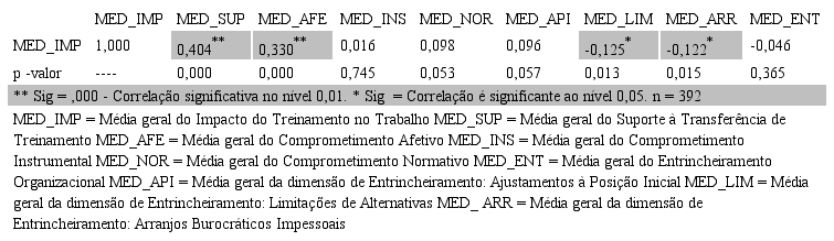Uma correlação positiva foi encontrada entre impacto do treinamento no trabalho e comprometimento afetivo (r = 0,303, p < 0,001). Entretanto, o mais interessante foi descobrir que a variável impacto possui uma relação negativa fraca com o fator de entrincheiramento organizacional “limitação de alternativas” (r = -0,125, p = 0,013) e com o fator “arranjos burocráticos impessoais” (r = -0,122, p = 0,015). Ou seja, quanto maior são os fatores de entrincheiramento organizacional “limitações de alternativas” e “arranjos burocráticos impessoais”, menor será o impacto dos indivíduos no setor de trabalho. Esses resultados demonstram que, quanto maior for a identificação do indivíduo com a organização e com os seus objetivos, mais ele se esforçará para realizá-los (MOWDAY; PORTER; STEERS, 1982), e, por conseguinte, maior será seu impacto no setor de trabalho. Por outro lado, o indivíduo que permanece na instituição somente por temer que a mudança faça com que ele perca a estabilidade, os ganhos financeiros e os benefícios adquiridos (arranjos burocráticos), sentindo-se entrincheirado na empresa devido à ausência de alternativas, pois verifica que não conseguirá espaço no mercado de trabalho (RODRIGUES, 2009), impactará menos no setor de trabalho.