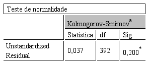 Fonte: dados da pesquisa.A partir do teste de Kolmogorov-Smirnov, constatou-se que os erros encontrados para as variáveis são normais, visto a significância é superior a 0,05. A ausência de multicolinearidade entre as variáveis foi verificada por meio da Tolerância.
