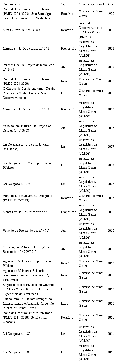 Fonte: elaborado pelos autores.Destacamos que os autores dos documentos são aqueles envolvidos na concepção da reforma administrativa do Estado de Minas Gerais e estão diretamente ligados à construção e organização dos documentos analisados, ou seja, refletem a visão e o interesse da administração direta do Estado de Minas Gerais.