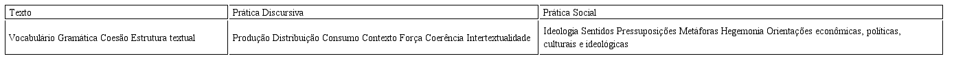 Nessa direção, Fairclough (2001) propõe um modelo tridimensional de análise: texto, prática discursiva e prática social (conforme Quadro 2).