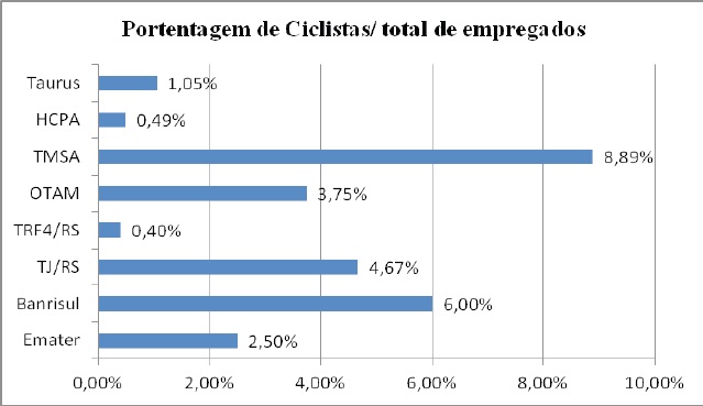 Fonte: elaborado pelos autores.Enquanto as organizações que têm maior quantidade de ciclistas são a TMSA, o HCPA e a Taurus, as que têm maior quantidade de ciclistas em relação ao total de funcionários do prédio são a TMSA, o Banrisul e o TJ/RS, sendo o menor índice apresentado pelo TRF4 e pelo HCPA, que não alcançaram 1% (Figura 1). Não foram encontrados estudos indicando metas a serem alcançadas ou níveis desejados a esse respeito.
