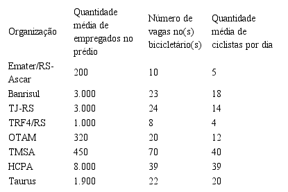 Fonte: elaborada pelos autores.Todas as organizações investigadas oferecem segurança nos seus bicicletários; alguns se situam no interior do prédio da empresa, e outros, em estacionamentos controlados por vigias. A segurança nos bicicletários é um fator de estímulo ao uso de bicicletas, conforme indicado no PDCI (2008).