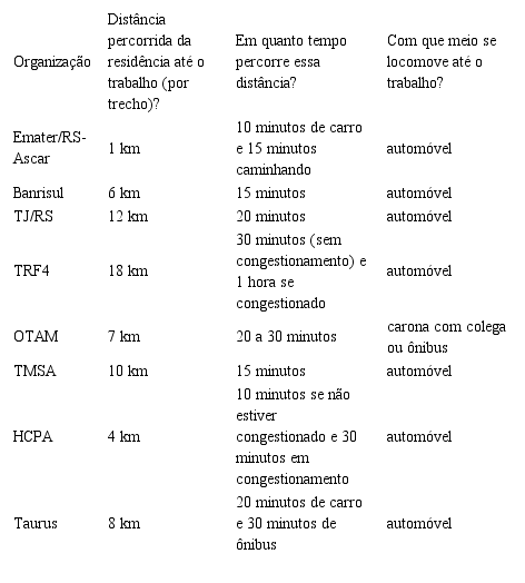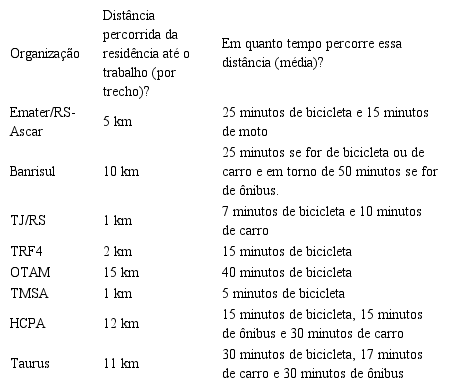 Ao questionar os entrevistados sobre a distância percorrida de sua residência até o trabalho, pode-se observar que há ciclistas que percorrem uma distância diária total de 30 km. Em relação ao tempo médio em que percorrem essa distância, nem todos os entrevistados puderem oferecer comparações da bicicleta em relação a outros meios de transporte, mas é importante observar que, em três organizações, os ciclistas percorrem o trajeto mais rápido de bicicleta do que por outros meios (Banrisul, TJ/RS e HCPA) e, em outras três situações, o trajeto é feito no mesmo tempo do que por outros meios de transporte (Banrisul, HCPA e Taurus).