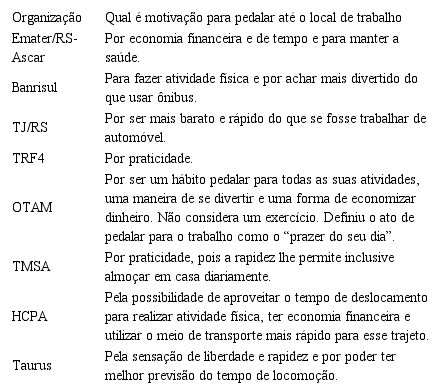 Questionados sobre o motivo de não pedalarem até o trabalho, todos os entrevistados citaram a falta de segurança/medo do trânsito. Aqueles que responderam “distância” (TJ/RS, TRF4 e Taurus) percorrem, respectivamente, 12 km, 18 km e 8 km. Ainda assim, tanto o entrevistado do TRF4 quanto a entrevistada da Taurus comentaram que, se existissem ciclovias, a distância não seria um fator relevante. Aqueles que responderam “higiene” (TJ e HCPA) percorrem, respectivamente, 12 km e 4 km, embora o TJ ainda não tenha chuveiros e o HCPA disponha de ampla estrutura. Eles relatam que as ações da organização servem como uma motivação para utilizar bicicletas, mas são insuficientes, explicando que, para a mudança de comportamento, seria necessário também que fossem implantadas ciclovias na cidade.