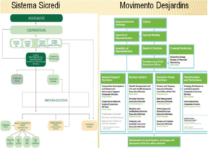 O Movimento Desjardins possui mais de 5 milhões de associados distribuídos entre 451 cooperativas. Foi considerada, em 2011, a 20. instituição mais segura do mundo (Global Finance, 2011). O Sistema Sicredi possui mais de três milhões de associados e 1.300 pontos de atendimento espalhados pelo Brasil. É a 7. maior rede de atendimento brasileira, que administra, atualmente, R$ 50 bilhões em Ativos Totais (Sicredi, 2015).