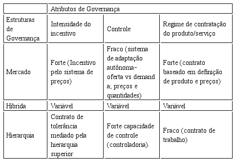 Fonte: Adaptada de Williamson (1991, 2003)Para Williamson (1991, 2003), enquanto a governança pelo mercado desenvolve grandes incentivos por meio do sistema de preços, tem pouco aparato de coordenação e busca resolver grandes conflitos nos tribunais; a governança pela hierarquia tem poucos mecanismos de incentivo econômico (salários) contrabalanceado por grande aparato de coordenação, além de resolver a maioria de seus conflitos internamente, por meio da mediação de uma hierarquia superior.