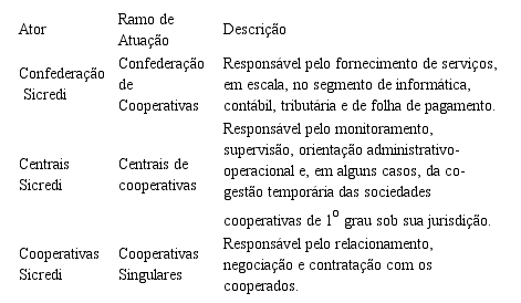 Fonte: Elaborada pelos autores (2013)Cabe ressaltar que tais sociedades foram criadas com funções centrais específicas dentro da rede. À semelhança do Movimento Desjardins, outras instituições foram criadas pelo grupo para fornecer serviços específicos às cooperativas. Além de instituições de caráter mais vinculado aos princípios do cooperativismo, tais como a Fundação Sicredi e a Sicredi Fundo Garantidor, a rede conta, também com instituições de caráter corporativo, vinculadas diretamente ao negócio do grupo.