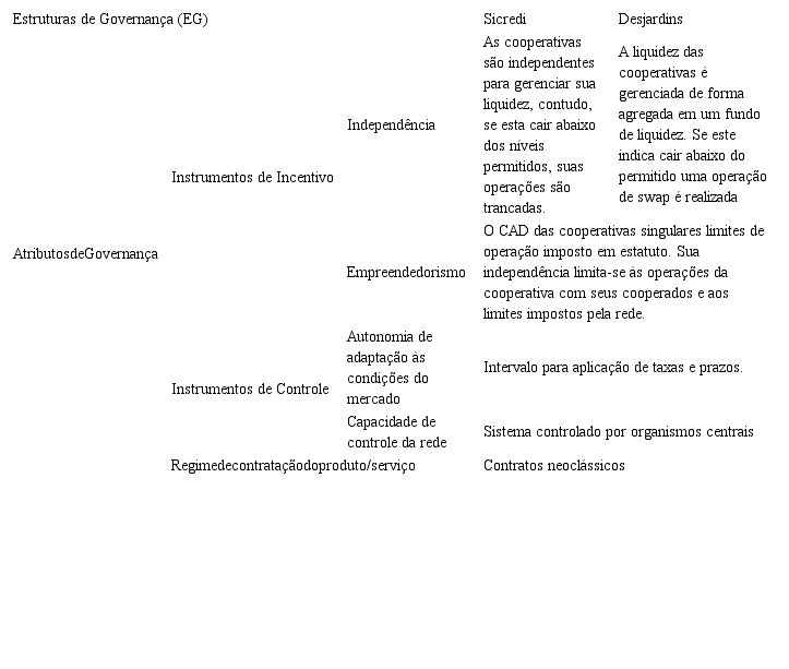 Resumindo, se na Hipótese do Alinhamento Discriminante, analisada por Williamson (2010), as características das transações são indutoras de formas de governança minimizadoras de CT; pode-se inferir que as características semelhantes das transações nas duas redes de Cooperativas de Crédito estão influenciando a evolução de EG semelhantes, com diferenças derivadas, basicamente de seu ambiente jurídico-institucional.