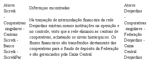 As diferenças na forma como esses custos são gerenciados dizem respeito ao formato jurídico empregado para essas instituições. Conforme mencionado, enquanto a Rede Desjardins utiliza uma “cooperativas de cooperativas”, com formato estabelecido e regulado em lei provincial. Já a Rede Sicredi utiliza-se de uma Sociedades por Ações de amparo jurídico-institucional genérico. Tais formatos derivam para diferentes maneiras de organizarem-se alguns processos de governança e condução das atividades.