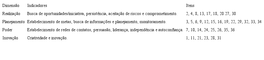 O instrumento é constituído por 36 itens, os quais são divididos em quatro grandes dimensões ou conjuntos, que são: realização, planejamento, inovação e poder. O Quadro 2 sintetiza cada dimensão com seus principais indicadores e os itens utilizados pelo Imae.