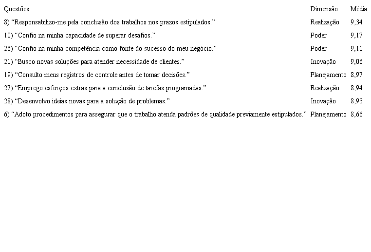 Para a análise dos dados, foram utilizados os valores da média, moda, frequência e desvio-padrão de cada questão, divididos nas quatro dimensões propostas pelo instrumento, que são realização, planejamento, poder e inovação. As médias variaram de 7,38 a 9,34, o que indica que os participantes respondentes adotam com frequência as atitudes descritas nas questões. A Tabela 3 descreve as questões com maiores médias de concordância encontradas na pesquisa.