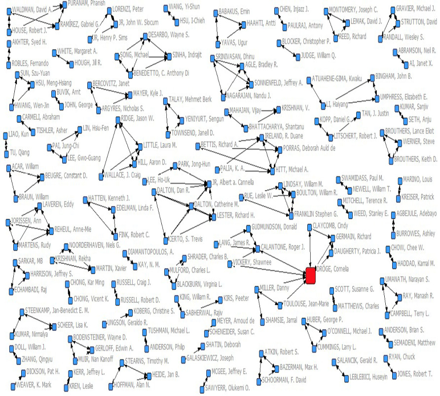 Entre os artigos analisados, observou-se a formação de redes de cooperação, entre autores, para o desenvolvimento de pesquisas sobre incerteza ambiental. Nesse sentido, Dröge (1986, 1988, 1994, 1999, 2001) recebe destaque pelo número de laços com seus pares, somando nove de entrada e nove de saída. Esses dados revelam que a autora, neste tema específico e nesta amostra de artigos, destaca-se pelas parcerias firmadas para o desenvolvimento de pesquisas científicas. Tais redes podem ser mais bem observadas na representação gráfica da Figura 1.