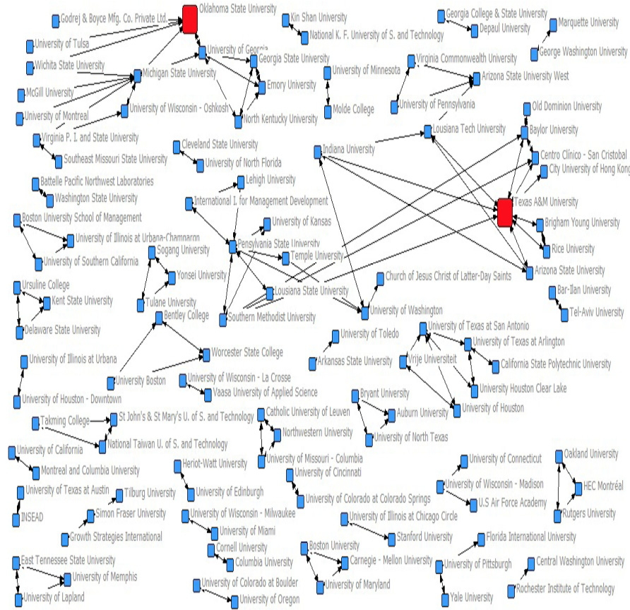 Nessa mesma linha de raciocínio, buscou-se identificar a existência de redes de cooperação entre as instituições dos pesquisadores, assim diversas articulações foram caracterizadas. As instituições Texas A&M University e Oklahoma State University, conforme a Figura 2, destacam-se das demais pelas parcerias que firmaram (laços de saída), num total de dez e nove, respectivamente.