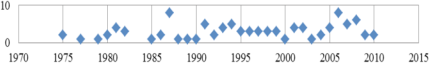 Na sequência, objetivando identificar a evolução no número de artigos publicados entre o período de 1975 e 2010, elaborou-se a Figura 3. Por meio desta, torna-se possível observar que, nos anos de 1987 e 2006, houve um aumento nas publicações, culminando no maior número de produções relacionadas ao tema incerteza ambiental, perfazendo um total de 16 pesquisas publicadas em periódicos de alto impacto.