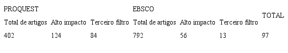Nesses moldes, foram utilizados os termos Environmental Uncertainty e Environment Uncertainty para localizar artigos referentes à incerteza ambiental nas bases de dados ProQuest e EBSCO. Considerou-se que essas palavras-chave deveriam constar no título ou no resumo dos trabalhos. Foram desconsiderados todos os artigos que não se encontravam completos, além das críticas literárias. Esse procedimento resultou em um total de 402 artigos na base ProQuest e 792 na base EBSCO.