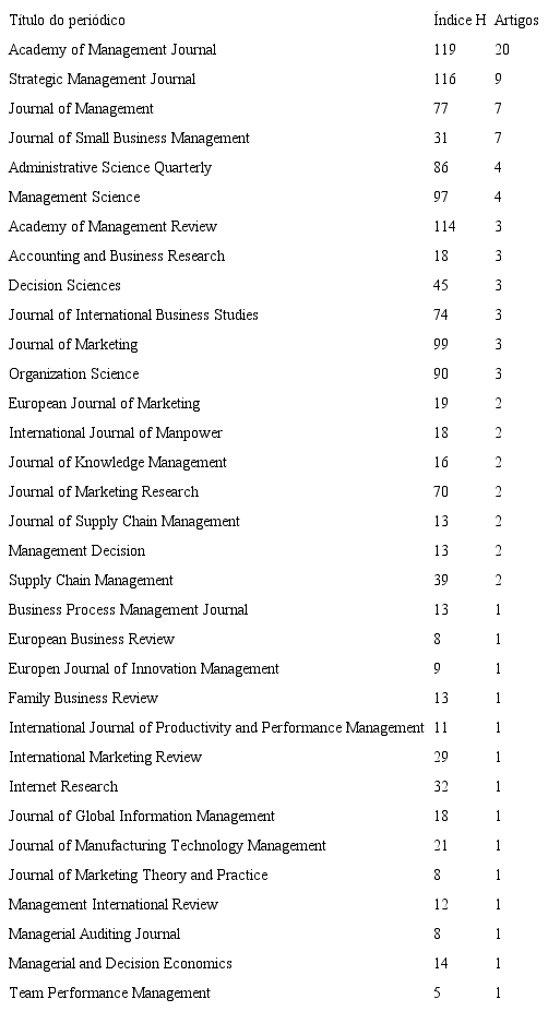 Visando explorar não somente os autores e suas respectivas instituições, o Quadro 2 sintetiza os periódicos e o número de artigos neles publicados. Esse indicador busca auxiliar futuras submissões de trabalhos, pois identifica os periódicos que possivelmente possuam linhas de interesse em trabalhos que abordem o tema incerteza ambiental. Observou-se que, entre todos os estudados no periódico Academy of Management Journal, foram localizados 20 trabalhos entre os anos 1975 e 2010, 11 a mais do que o segundo com maior número de publicações, a saber, Strategic Management Journal.