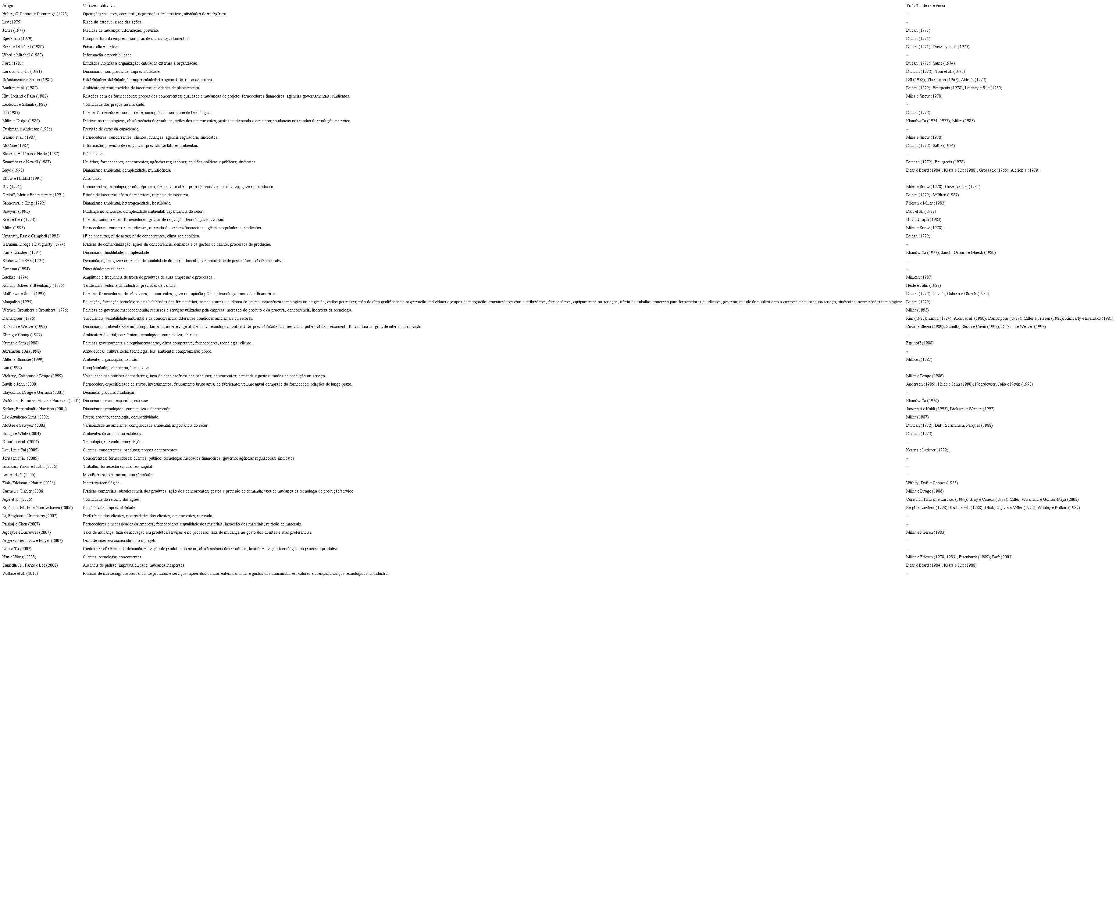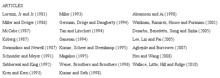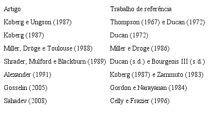 Além dos trabalhos apresentados no Quadro 3, evidenciam-se também os trabalhos de: Koberg e Ungson (1987), Koberg (1987), Miller, Dröge e Toulouse (1988), Shrader, Mulford e Blackburn (1989), Schneider e Meyer (1991), Russell e Russell (1992), Alexander (1991), Lang, Calantone e Gudmundson (1997), Gosselin (2005), Moschuris (2007), Sahadev (2008), Sun, Hsu e Hwang (2009), Townsend, Yeniyurt e Talay (2009) e Semadeni e Anderson (2010), que não tiveram suas variáveis especificadas pelos autores.
