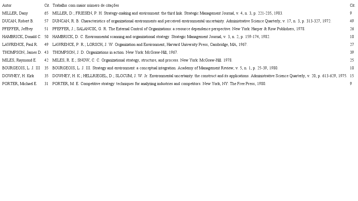 As redes identificadas anteriormente não revelam, em regra, que os autores em destaque são os que mais produziram trabalhos sobre incerteza ambiental (apenas as redes de seus relacionamentos), no entanto, nesta pesquisa em específico, a exceção a essa regra deve ser aplicada. Dröge (1986, 1988, 1994, 1999, 2001), além de destaque em termos de redes de cooperação de autores, também é grafada como autora na maior quantidade de artigos publicados, somando um total de cinco artigos. Na sequência, aparecem Miller (1986, 1988, 1999), Litschert (1980, 1994), Hitt (1982, 1987), Ireland (1982, 1987), Koberg (1987), Sabherwal (1992, 1994), Sawyerr (1993, 2003), Germain (1994, 2001), Calantone (1997, 1999), Li (2002, 2007) e Cannella Jr. (2006, 2008), com dois trabalhos publicados cada um. Torna-se importante ressaltar que não foram diferenciadas as ordens de assinatura de autoria dos trabalhos. Nos demais trabalhos analisados, os pesquisadores publicaram apenas um artigo.