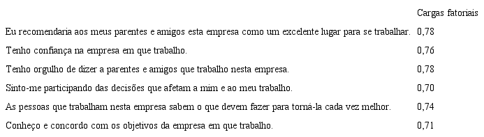 Por ser considerado fator distinto da comunicação e ter literatura própria, o fator comprometimento foi analisado apenas no processamento da análise fatorial confirmatória, juntamente com os três fatores de comunicação identificados na análise fatorial exploratória. As seis assertivas utilizadas na mensuração do comprometimento estão expostas a seguir, na Tabela 2, com as suas cargas fatoriais.