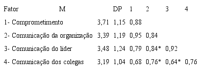 A menor média foi de comunicação entre colegas (3,19), e a maior, a de comprometimento (3,71). Os índices de confiabilidade Alpha de Cronbach foram satisfatórios em comprometimento (0,88), comunicação organizacional (0,84), comunicação do líder (0,92) e comunicação dos colegas (0,76).