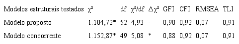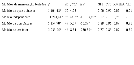 A Tabela 4 apresenta as estatísticas de ajuste para o modelo de mensuração. Os índices mostram que o ajuste de medição proposto obteve melhores índices de ajuste aos dados em relação aos modelos concorrentes testados X² (52, N = 800) = 1.104,43, p < 0,01, X² /df = 4,93, GFI = 0,90, CFI = 0,92, RMSEA = 0,07, TLI = 0,91), apesar de o valor X² ser significante, o que também pode ser observado na avaliação do modelo estrutural, na mesma tabela.