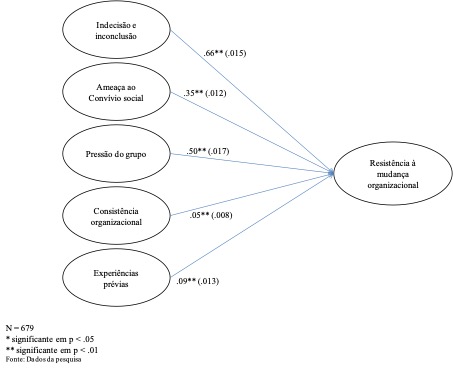 Os resultados da análise confirmatória indicam que a indecisão e inconclusão em relação ao processo de mudança influencia positivamente a resistência individual com a mudança organizacional, λ = 0,66, t (679) = 42,64, p < 0,001, confirmando a hipótese 1. Ou seja, quanto maior a indecisão e a inconclusão do funcionário sobre o processo de mudança organizacional, maior o nível de resistência individual a esta. A hipótese 2 também foi confirmada, sugerindo que quanto maior a ameaça ao convívio social percebida pelo funcionário público, maior a resistência individual, λ = - 0,35, t (679) = 28,41, p < 0,001.