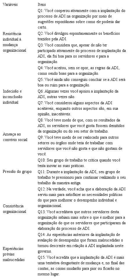 Os itens que medem as variáveis avaliadas neste estudo foram selecionados a partir do instrumento desenvolvido e validado para a realidade brasileira por Marques, Chaves e Dias (2005) e das pesquisas realizadas por Borges e Marques (2009) e Almada (2014). Essas pesquisas reportaram índices de confiabilidade composta superior a 0,90. As questões são referentes às variáveis resistência individual à mudança organizacional, indecisão e inconclusão individual, ameaça ao convívio social, pressão do grupo, consistência organizacional e experiências prévias malsucedidas. Foi utilizada a escala do tipo Likert, variando de 1 a 6, em que 1, ‘discordo totalmente’, representa a aceitação e cooperação ativa com a mudança organizacional e 6, ‘concordo totalmente’, representa a resistência ativa à mudança organizacional. Embora seja menos comum, a escala de 6 pontos apresenta a vantagem de fazer com que os respondentes se comprometam com o aspecto positivo ou negativo do item medido. A Tabela. 1 relaciona os itens do questionário com as variáveis medidas.