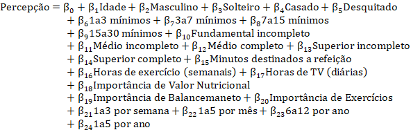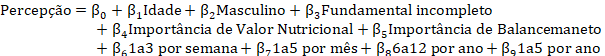 A fim de garantir que as regressões não sofressem com problemas de multicolinearidade, foram calculadas as correlações entre as demais variáveis, como mostrado pela Tabela 2. Observa-se que Idade e Percepção têm uma correlação de -0,38; Importância de Balanceamento e Importância de Valor Nutricional de 0,41; e Percepção e Consumo de 0,52; enquanto as demais variáveis não têm correlação significativa. Devido a esses valores, acima de 0,3 será verificado o Fator de Inflação da Variância (VIF) após a estimação da regressão, para que seja verificado se existe algum problema de multicolinearidade caso essas variáveis sejam significativas.