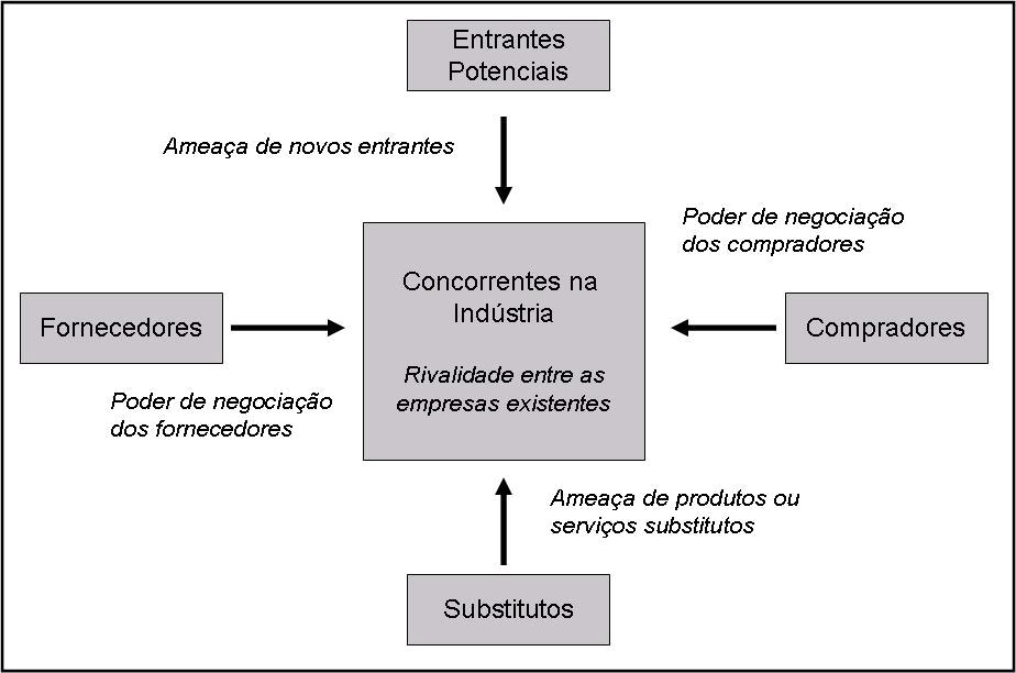 Desta forma, para compreender os efeitos do fator indústria, que determina o comportamento das multinacionais, vamos considerar as cinco forças de Porter (1980), que dirigem a concorrência na indústria descrita em seu quadro de diamante, conforme mostra a Figura 1.