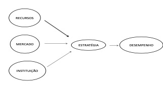 Assim, com base no “modelo do tripé estratégico” de Peng (2009), consegue-se incorporar as três perspectivas (recursos, mercado e instituição), que o autor considera fundamentais na determinação da estratégia prosseguida por parte das empresas, conforme demonstra a Figura 2.