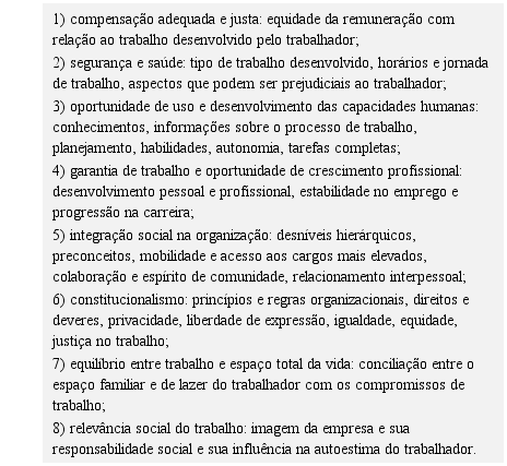 Nessa linha, o equilíbrio entre trabalho e espaço total de vida do trabalhador desponta nos estudos de Walton (1973), que destaca oito vetores inter-relacionados que influenciam a QVT conforme o quadro 2: