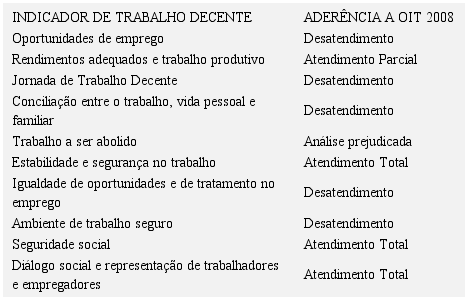 Neste indicador ficou evidenciado a clara inadequação aos critérios do trabalho decente da OIT, 2008. Isso se comprovou, notadamente, nos direitos fundamentais no trabalho e qualidade no emprego, por circunstâncias, que a exemplo do que fora referido nas análises anteriores, tem estreita ligação também com outros indicadores, como ambiente e jornada de trabalho e igualdade.