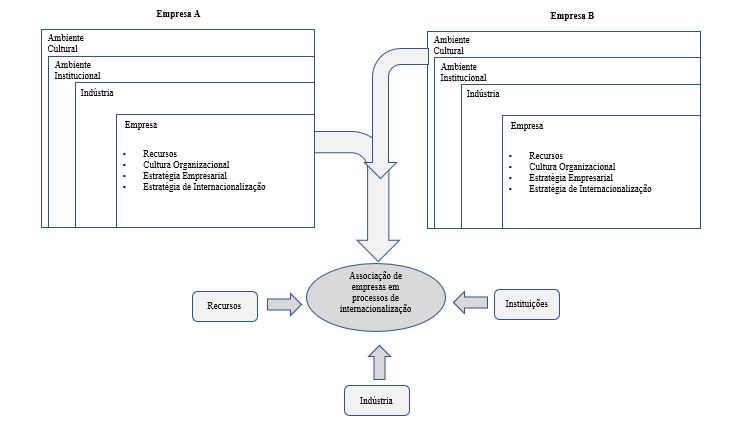 Quando se trata de questões culturais em processos de internacionalização, a presença do aspecto institucional está, no mínimo, implícita. A figura 1, a seguir, auxilia na compreensão dos vários ambientes em que empresas de diferentes países estão inseridas, uma vez que sumariza os diferentes ambientes em que duas empresas estão inseridas durante o processo de associação entre elas, via processo de internalização.