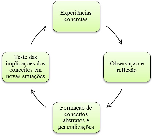 Ao criar ambientes de aprendizagem onde os estudantes possam refletir e agir sobre a realidade, o sistema educacional terá maior oportunidade de atingir sua meta. O Ciclo de Aprendizagem Vivencial (CAV) (KOLB; RUBIN; MCINTYRE, 1978) aborda o desenvolvimento de atitudes, de conhecimentos e de habilidades em um ciclo onde o conhecimento é formado a partir da transformação da experiência vivida pelo indivíduo. O processo de aprendizagem é tanto ativo quanto passivo, tanto concreto quanto abstrato, podendo ser concebido como um ciclo de quatro estágios: (1) experiência concreta; (2) observação e reflexão; (3) formação de conceitos abstratos e generalizações; e (4) hipóteses a serem testadas no futuro que levarão a novas experiências, conforme ilustrado na Figura 1.