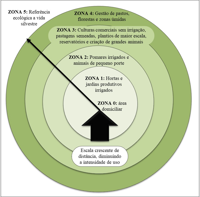 Durante a confecção, os estudantes mostraram-se dispostos a aprender e a empregar seus conhecimentos sobre sustentabilidade na propriedade rural que estava sendo moldada na maquete. A elaboração da maquete seguiu os princípios da permacultura, e todos os elementos foram elaborados de modo a otimizar os recursos advindos da natureza, sendo a maquete dividida em zonas permaculturais. Essas zonas são áreas mais ou menos concêntricas de intensidade de uso, as quais descrevem o poder e a ciência das pessoas que trabalham a partir do ponto focal, uma morada, conforme exposto na Figura 2.