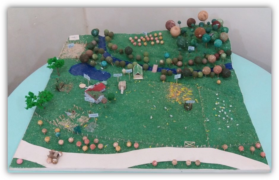 A maquete buscou refletir as irregularidades do terreno, a fim de demonstrar de forma mais próxima da realidade os aspectos da propriedade rural sustentável, além de elencar elementos e culturas comuns às propriedades da região da escola. Além disso, destaca-se que, na Zona 0, a localização da casa foi planejada de modo a aproveitar a luz proveniente do período da manhã, sendo que a casa sustentável contou com telhado verde para melhor aproveitamento e retenção do calor, bem como uma cisterna para reaproveitamento da água da chuva. Ainda buscou-se mostrar a preservação da mata nativa na Zona 4 e a preservação das matas ciliares no rio e na estrada. A Fotografia 1, abaixo, apresenta a maquete elaborada: